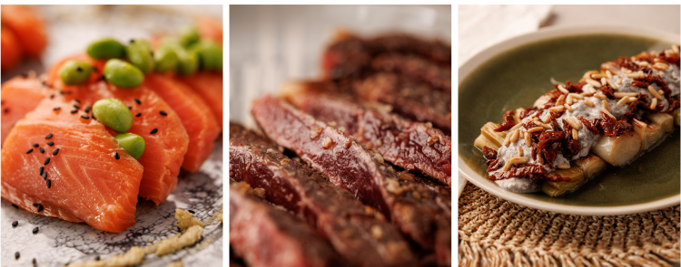 Lomos de Salmón Noruego Ahumado Natural con Cordel en Frío acompañado de Edamames, Sésamo Negro y Mousse de Piparra (aprox. 6 pers.)
